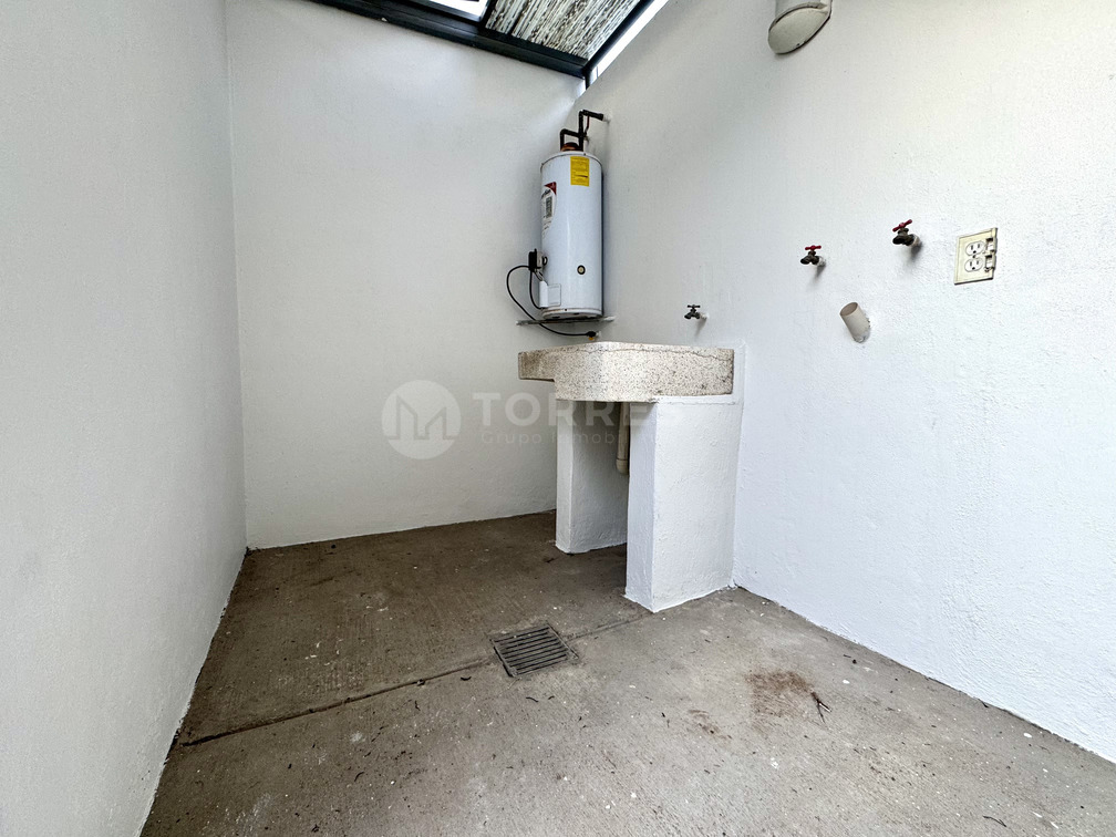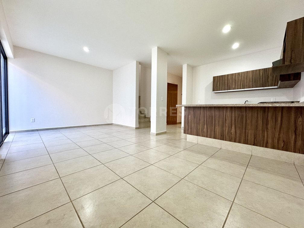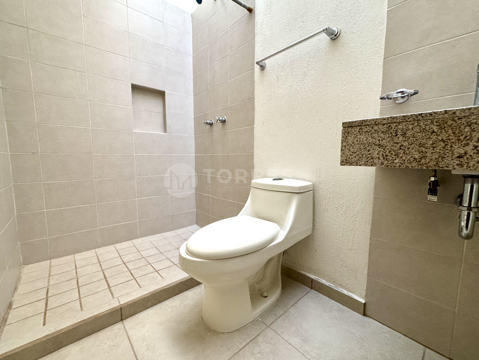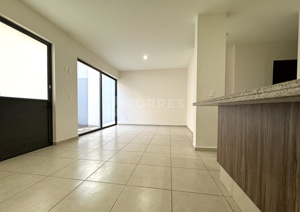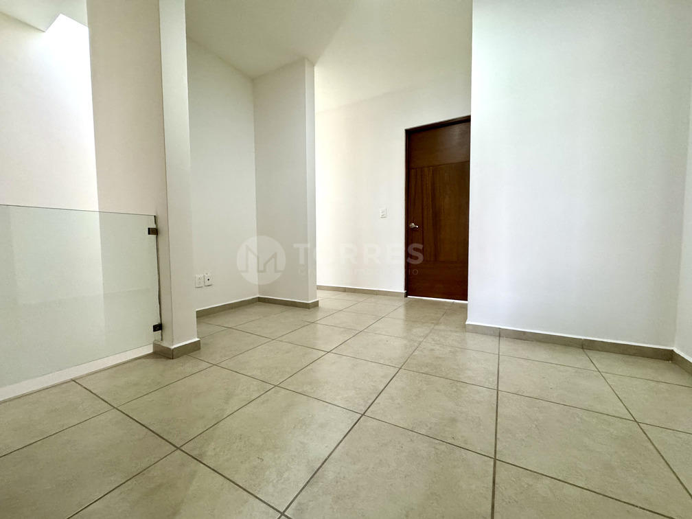En planta baja cuenta con un estudio que puede funcionar como recámara, baño completo, sala comedor, cocina con barra de granito y gran capacidad de almacenamiento. Además, jardín posterior y cuarto de lavado techado.