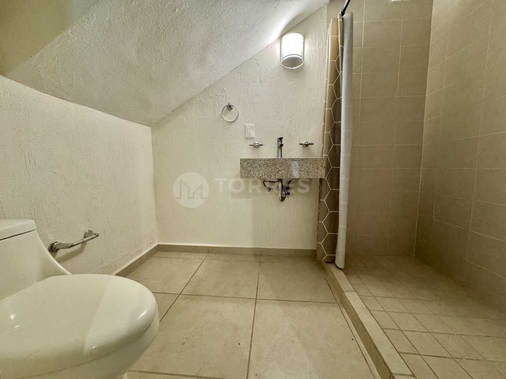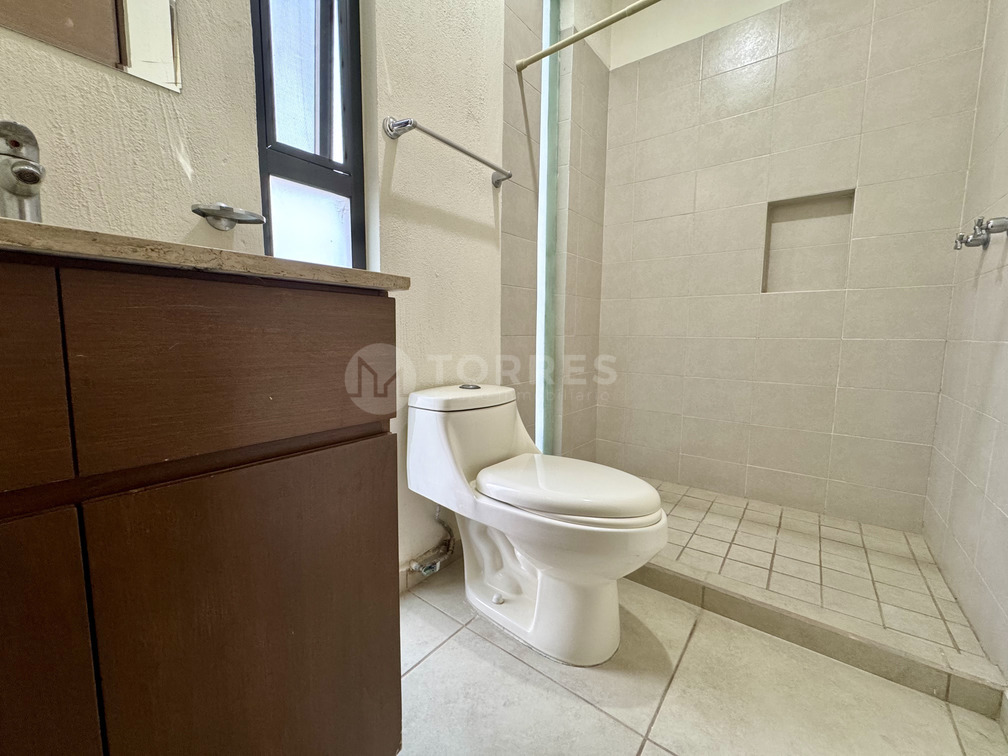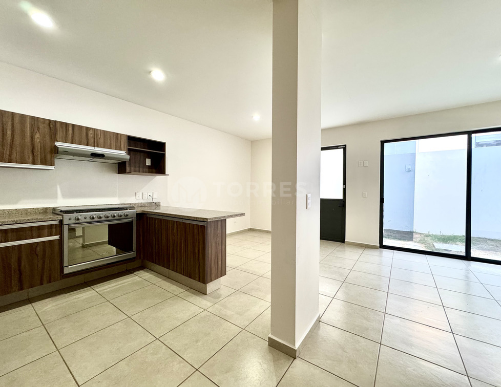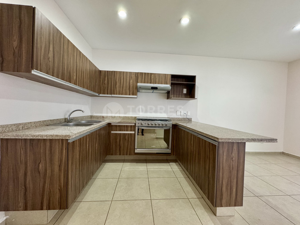 En planta baja cuenta con un estudio que puede funcionar como recámara, baño completo, sala comedor, cocina con barra de granito y gran capacidad de almacenamiento. Además, jardín posterior y cuarto de lavado techado.