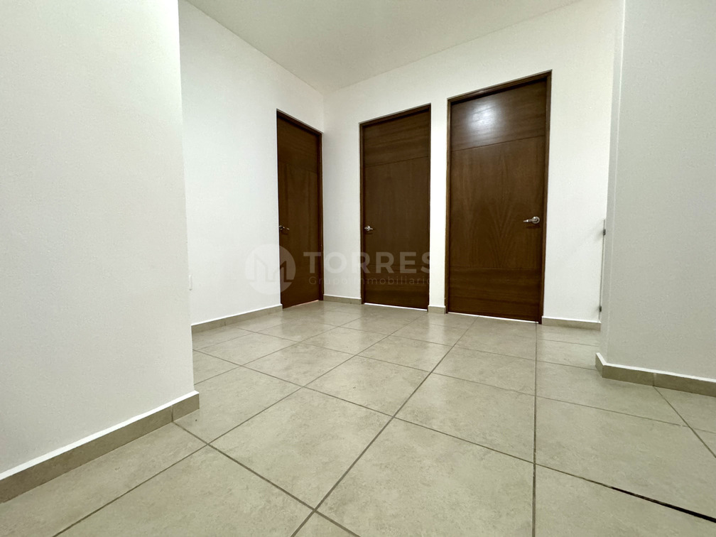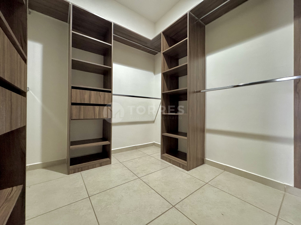 La planta alta ofrece tres habitaciones. La recámara principal tiene baño completo y vestidor, mientras que las dos habitaciones secundarias comparten un baño adicional. La distribución es funcional y pensada para el confort familiar.